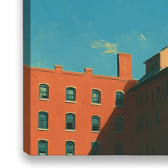 Een massief industrieel complex domineert het beeld. Een licht, meer verdiepingen tellend fabrieksgebouw met strakke rijen ramen rijst op onder een intens blauwe lucht. Op het dak staan twee watertanks, daarnaast torent een hoge, rode schoorsteen omhoog. Op de voorgrond liggen lagere delen van het gebouw in de schaduw; enkele ramen…