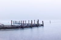 Oude verweerde steiger in de mist aan de Oostzee op het eiland Rügen