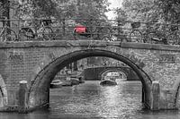 Op dit zwartwit werk van een uit 1722 daterende brug op een Amsterdamse gracht, wordt een fiets met een rode fietstas geaccentueerd.