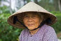 Een statige oude dame met een traditionele Vietnamese Conische hoed. De foto is gemaakt in het dorp My Lai in Vietnam.