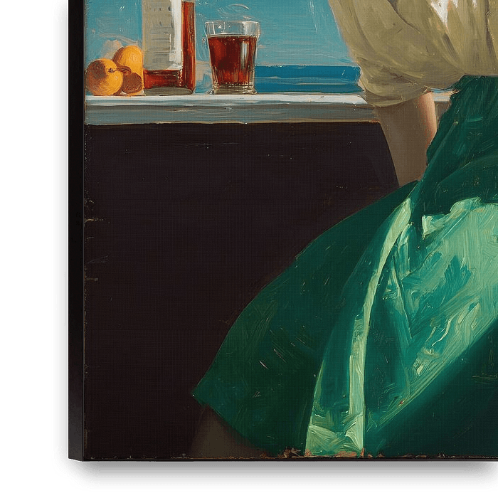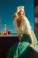 Het schilderij toont een oudere, elegante vrouw op haar terras op een warme avond in de jaren 1950, vastgelegd in de stijl van Edward Hopper. De scène wordt gekenmerkt door een kalme, introspectieve sfeer, die wordt versterkt door spaarzame licht- en schaduweffecten. De vrouw zit ontspannen op een balustrade, heeft een drankje naast…