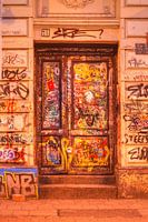 Oude deur met graffiti in de schemering in Ostertor-Quarter, Bremen, Duitsland, europa I Oude deur met graffiti in de schemering in Ostertor-Quarter, Bremen, Duitsland, europa