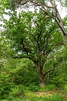Een zeer oude eik staat in het bos