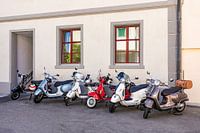 Diverse Italiaanse scooters in verschillende kleuren, oud en modern, tweetakt en viertakt, tijdens een ritje in Zwitserland.