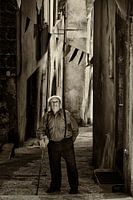 Ik liep door deze steeg en zag een oude vrouw die mijn kant op kwam lopen haalde mijn toestel uit mijn tas en wilde een foto van haar maken maar toen ik door de zoeker keek, was ze verdwenen, ze was namelijk net thuis aangekomen. Op dat moment kwam haar overbuurman naar buiten om haar te begroeten, hij zag me staan en nam spontaan deze pose aan.