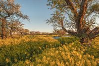 Oude fruitbomen omringd door bloeiend koolzaad. Een betoverende plek waar geschiedenis en natuur samenkomen.