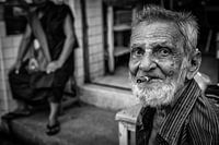 Oude getekende man rookt een cheroot sigaar in de straten van Yangon van Wout Kok
