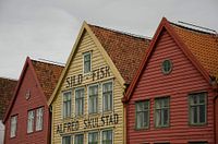 De vrolijk gekleurde oude houten gevels van de handelskade 'Bryggen' in het Noorse Bergen.