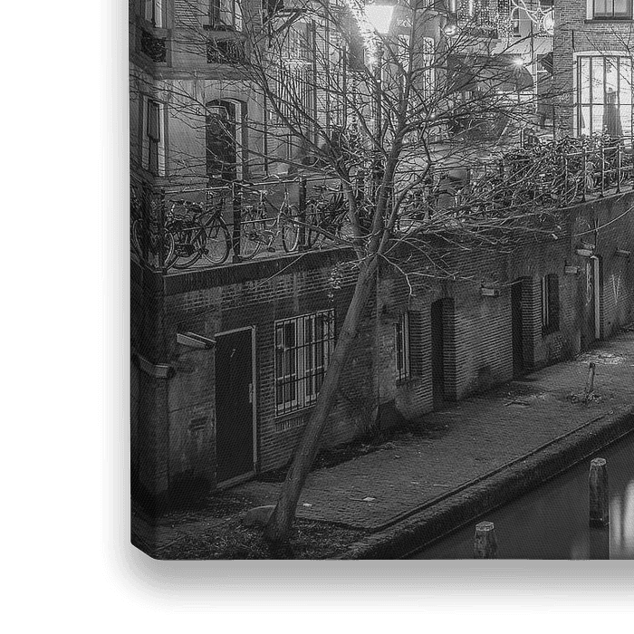 Koop de foto Oude gracht en vismarkt in zwart wit van Elles Rijsdijk op canvas, aluminium dibond, (ingelijste) fotoprint, behang en ArtFrame, op maat geprint in Fine-Art kwaliteit.