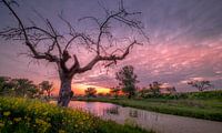 Een betoverend tafereel van een prachtige zonsopkomst bij een oude grillige fruitboom te midden van een koolzaadveld. Een sfeer van magie en verwondering, waarbij de natuurlijke elementen samenwerken om een onvergetelijke scène te creëren.