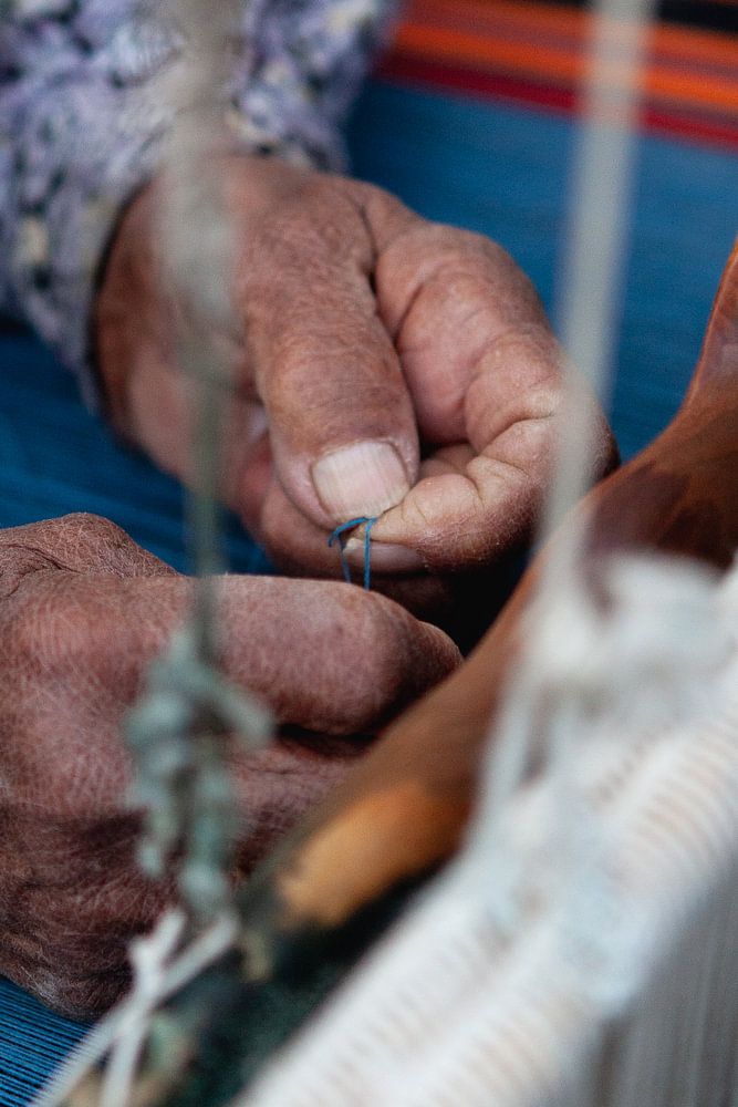 Oude handen van een traditionele weefster in Varzaneh, Iran
