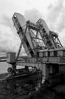 De oude voormalige cruise-terminal in de oude haven van Cherbourg, in Frankrijk, Normandië. Mooi industrieel erfgoed. Verroeste stalen constructie.