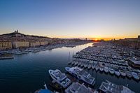 Zonsondergang over de oude haven vanuit het reuzenrad in Marseille, Frankrijk.