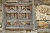 Oude houten luiken in een stenen muur. Digitaal bewerkt als een leuk schilderwerk.