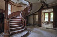 Dit intrigerende ontwerp toont een majestueuze, maar verouderde houten trap in een verlaten gebouw. De elegante, spiraalvormige leuning en gedetailleerde houtsnijwerken geven een nostalgische uitstraling, terwijl de afgebladderde verf en de verwaarloosde staat van het gebouw een gevoel van verval oproepen. Licht dat door het raam naar binnen valt, benadrukt de verlaten sfeer en brengt de texturen van het hout en de verweerde muren tot leven. Dit beeld is perfect voor liefhebbers van vintage architectuur en degenen die de schoonheid van het vergankelijke willen vastleggen.