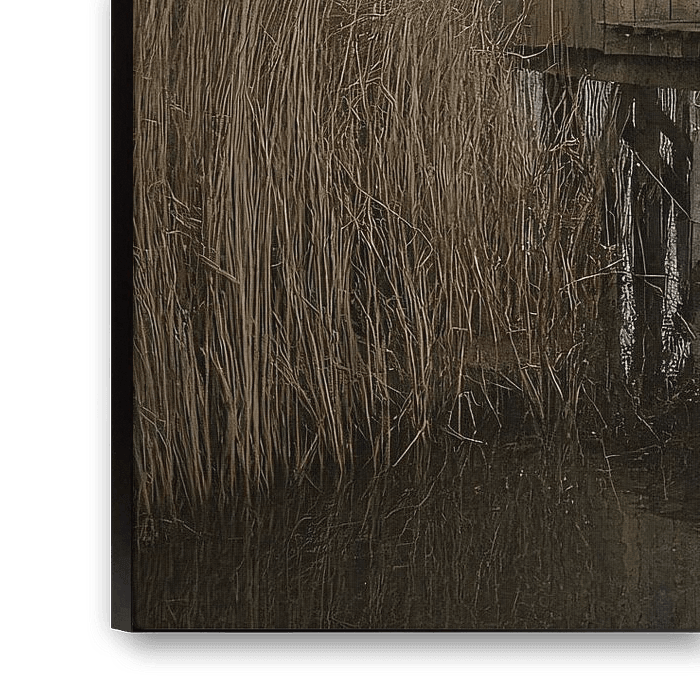Deze sfeervolle foto toont een eenvoudige, verweerde vissershut op houten palen, omringd door hoge rietplanten en het serene water van een meer. De subtiele aardetinten en rustige sfeer maken deze afbeelding perfect voor een klassiek en rustgevend interieur. De gedempte kleuren en zachte reflecties van het water geven het geheel een nostalgische uitstraling. Ideaal voor liefhebbers van rustieke of natuurgerichte decoraties, deze afbeelding voegt een kalmerende en authentieke sfeer toe aan elke ruimte.