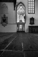 Dit werk toont de Doopkamer van de Oude kerk in hartje Amsterdam. De foto is gemaakt vanuit een laag perspectief waardoor men over de eeuwenoude grafzerken heen naar de Doopkamer kijkt. De hoge kerkramen verzorgen een fraaie lichtinval in de donkere kerk.
