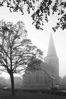 Deze foto laat de oude kerk van Borne zien in de mystieke sfeer van mist aan het einde van een koude middag.