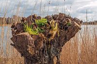 Closeup van een gesnoeide oude knotwilg aan de rand van het water en omringd met rietstengels. Frisse groene planten hebben zich gevestigd op de top van de boom. De foto is gemaakt op een bewolkte dag aan het eind van het winter seizoen.
