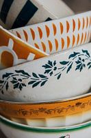 Geel en groen (Jaune et vert) oude franse kommen. Oud Frans servies wat leuk is voor bijvoorbeeld in een woonkeuken. Gestruind op brocante markten en leuke brocante winkeltjes in binnen en buitenland. Landelijk en waan je in La Douce France sfeertje. De franse drinken hier hun bv koffie en chocolademelk uit.