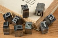 Oude loden drukletters uit een boekdrukkerij. Als collage geplaatst in en op een antiek verkleurd boek.
