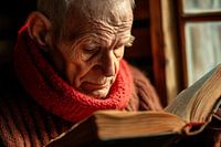 In een warme lichtstraal zakt een oudere man weg in de bladzijden van een dik boek, zijn diepe plooien vertellen verhalen van vervlogen tijden. De rode sjaal om zijn nek straalt geborgenheid uit, terwijl de gezelligheid van het moment perfect is voor een leeshoekje in de woonkamer. Hier vind je rust en inspiratie!