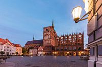 Oude markt met de Nikolaikirche en het gotische stadhuis in Stralsund 's avonds
