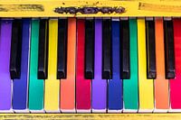 Oude houten piano met kleurrijke toetsen en metalen ornament aan de bovenkant.