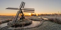 Een oude windmolen in het waterlandschap tijdens een winterse zonsopkomst. Er ligt een laagje rijp op het gras en de rietstengels. Kalenberg, Overijssel in Nederland.