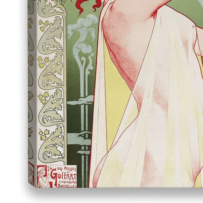 Een vrouw prijst een drankje aan op een poster, naakt onder een dun gewaad. De meid is nagenoeg bloot, heeft haar haar op een knot en haar heup, bil, buik, rug, torso, borsten, schouder en armen zijn zichtbaar.