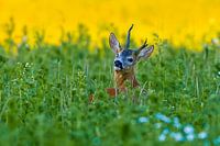 Oude reebok in een weiland met bloemen en kruiden op een zomerochtend