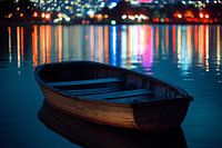 Dit ontwerp straalt een serene en rustige sfeer uit. Een oude, verlaten roeiboot dobbert rustig op het wateroppervlak, met schitterende weerspiegelingen van stadslichten in het kalme water. De zachte maar levendige kleuren van de stad verlichten de nacht en creëren een sfeervol contrast met de eenzame boot. De perfecte compositie en het gebruik van warme en koele kleuren geven het beeld een tijdloze kwaliteit. Dit werk is ideaal voor een interieur dat warmte, diepte en een vleugje mysterie wil toevoegen. De combinatie van rust en de stille aanwezigheid van de natuur maken het een kunstwerk dat je steeds opnieuw wil bekijken.