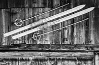 Zwart-wit foto Oud paar ski's bij een skihut bij Savognin in de Zwitserse Alpen, Graubünden, Zwitserland