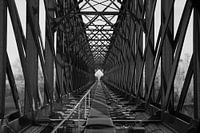 Zicht over het spoor van de oude spoorbrug bij het Duitse Griethausen nabij Kleef.
