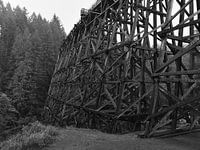 Zwart-wit foto van de historische Kinsol Trestle spoorbrug op Vancouver Island, British Columbia, Canada temidden van dichte naaldbossen.