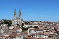 Mooi uitzicht op het dak van de historische stad Niort en de St Andre's kerk, in het Deux-Sèvres departement in het westen van Frankrijk. Franse stadsgezicht reisfotografie.