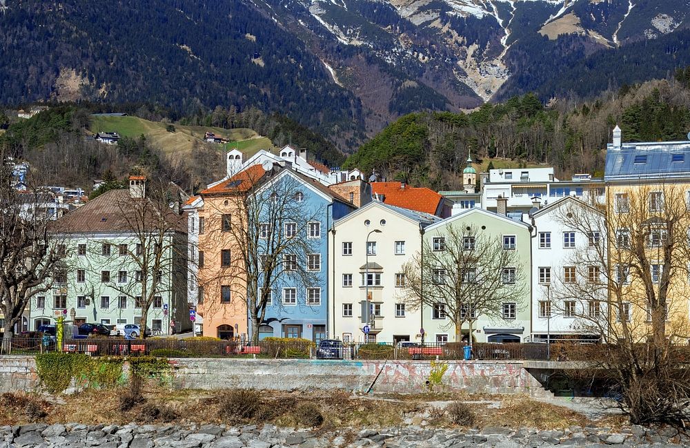 Oude stad aan de oever van de Inn in Innsbruck met uitzicht op de Alpen