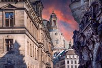 Oude stad in Dresden met Frauenkirche bij zonsondergang
