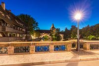 Panoramisch uitzicht vanaf de Max-brug naar de Schlayerturm en de Kettensteg in de oude stad van Neurenberg bij nacht, Franken, Beieren, Duitsland.