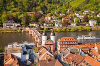 Oude brug met de brugdeur en een excursieboot op de Neckar in Heidelberg, Duitsland.