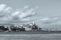 Zwart-wit foto van de oude stad Antibes met het Château Grimaldi en de historische stadsmuur, Côte d'Azur, Frankrijk