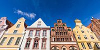 Historische zuilenhuizen in de oude stadskern van Stralsund.