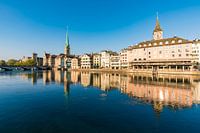Panoramisch uitzicht op de Wühre Ufer met de Fraumünster, St. Peter en het Hotel Storchen in de oude stad van Zürich.