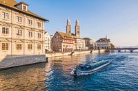 Excursieboot op de Limmat voor het stadhuis en de Grossmünster in Zürich, Kanton Zürich, Zwitserland.