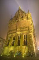 Oude stadhuis van de stad Kampen tijdens een mistige avond in november. Het Oude Raadhuis in de Oudestraat is tegenwoordig onderdeel van het Stedelijk Museum en onder andere een trouwlocatie.