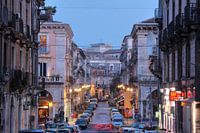 Via Della Lettera, oude huisgevels, schemering, oude stad, Catania, Sicilië, Italië