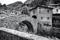 Zwart-witfoto van de oude stenen brug in het dorpje Fabbriche di Vergemoli in Toscane. Zijaanzicht van de structuur. Op de achtergrond het berglandschap van Toscane.