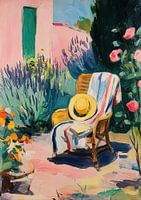 Dit vintage olieverfschilderij toont een oude houten stoel met een gestreepte hoes en zonnehoed, geplaatst in een tuin vol lavendel, rozen en potplanten. Roze muren en zacht zonlicht complementeren het tafereel. In impressionistische stijl boeit het werk met dikke, brede penseelstreken en lichte pastelkleuren. De centrale compositie…