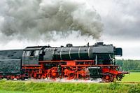 Oude stoomtrein trekt treinwagons voort tijdens een bewolkte zomerdag op het platteland. Dikke rook komt uit de schoorstenen van de stoomlocomotief.