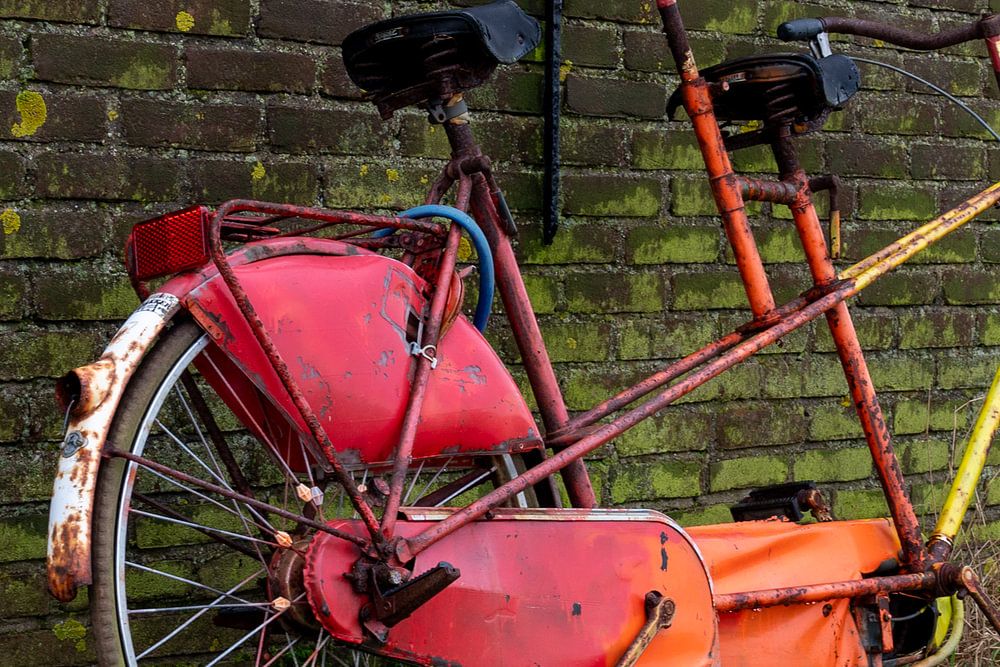 Oude tandem fiets tegen een muur. kleurrijke fiets die is achtergelaten bij een oude schuur.